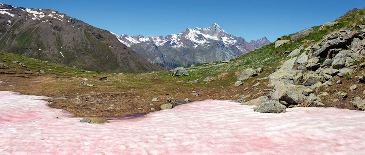 The song may refer to a white Christmas, but snow can also be pink and is sometimes called watermelon snow. The coloration is caused by a species of ice-loving algae, Chlamydomonas nivalis. This organism contains chlorophyl (green), but also has a carotenoid, which is reddish (think carrots). When the snow melts, the algae activates the carotenoid, using it as a sunscreen. (This isn’t new. Aristotle wrote about seeing pink snow in 300 BC.)